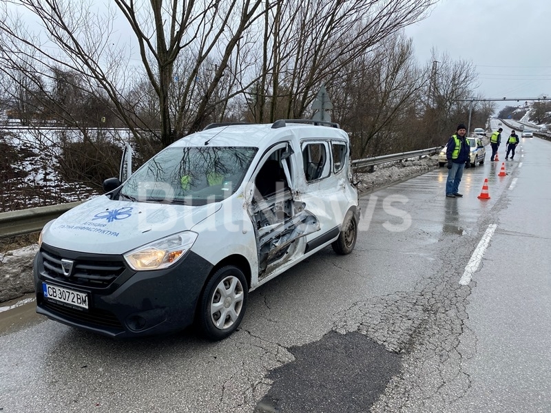 Инцидентът е станал преди минути, малко след отбивката за железничарския град, в посока Враца. Служебният автомобил е бил спрял на пътното платно, при което идващият камион е тръгнал да я заобикаля и я е ударил странично. Тежкотоварното возило е повлякло леката кола, водачът загубил контрол над управлението и камионът се качил върху мантинелата.