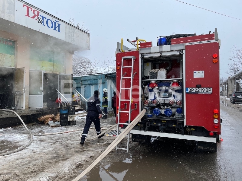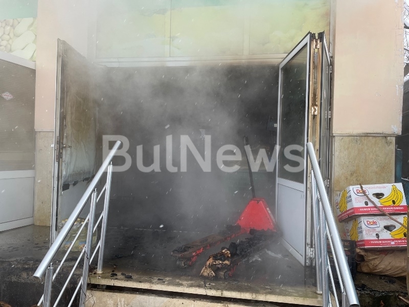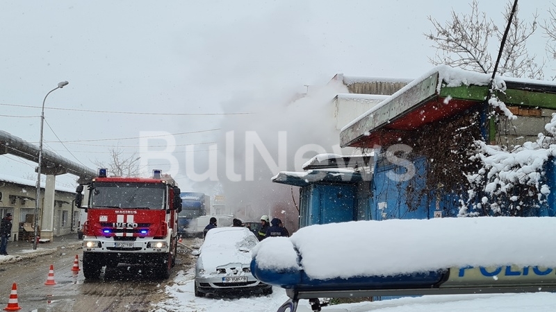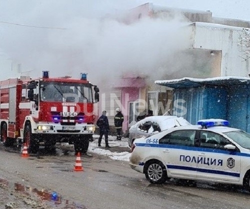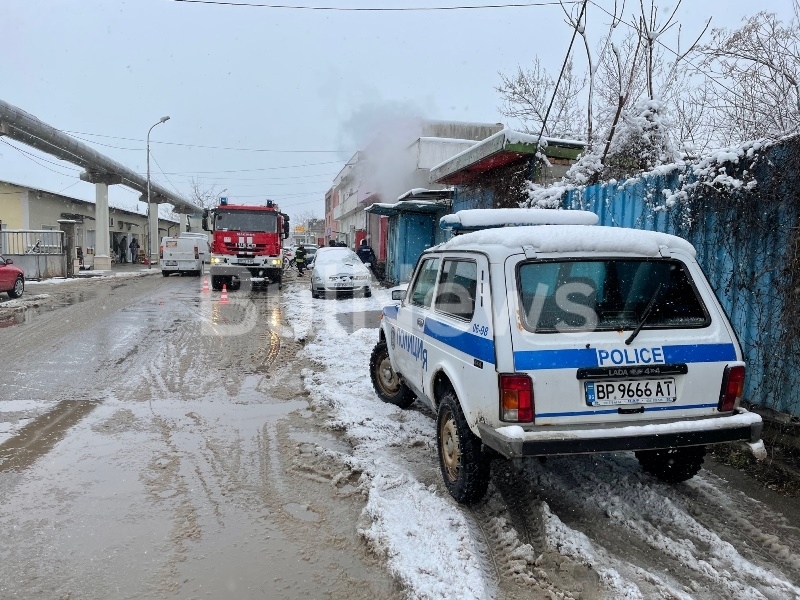 На мястото има две пожарни коли и патрулка, като няколко огнеборци, оборудвани с противогази, все още се борят с пламъците.