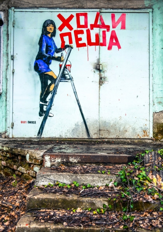 Трафопост в столичния квартал "Лозенец" осъмна с репликата "Ходи пеша", изписана лично от стилизиран образ на доста по-слаба и дори красива Караянчева. Тя е покатерена на стълба и е стиснала поцинкова кофа с червена боя, с която е написала възванието си. Както е известно, преди да бъде открита за голямата политика, кърджалийската акъллийка, посрамена вовеки от Бойко Борисов със сполучливо вулгарно прозвище, е работила в завод за поцинкови кофи. Автор на графита е артист, подписващ се като 321emirca.