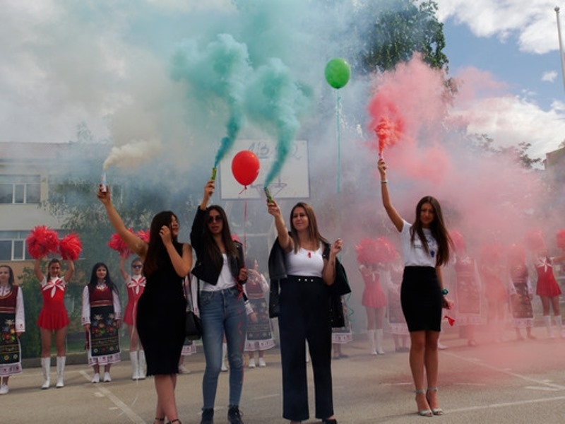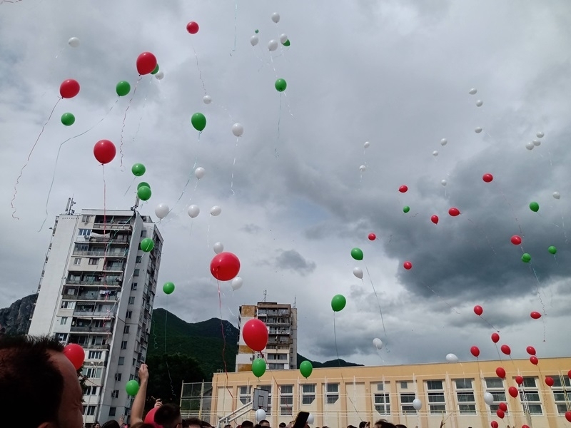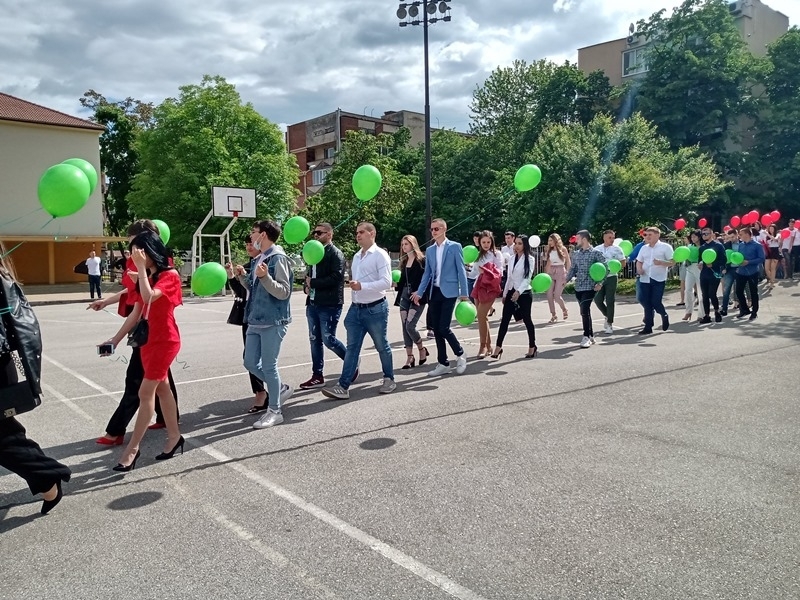 Днес за последен път те прекрачиха училищния праг, за да се срещнат със своите съученици и учители. След последния час на класа, зрелостниците бяха изведени от класни ръководители. Под шпалир от мажоретки и с аплодисменти от ученици, завършващите се отправиха към двора на гимназията за тържествено изпращане. Дванадесетокласниците бяха приветствани от директора г-жа Татяна Василева, която им пожела на добър час и успешна реализация. В знак на своя непрестанен устрем напред и нагоре, абитуриентите пуснаха в небето балони с пожелания в бяло, зелено и червено.