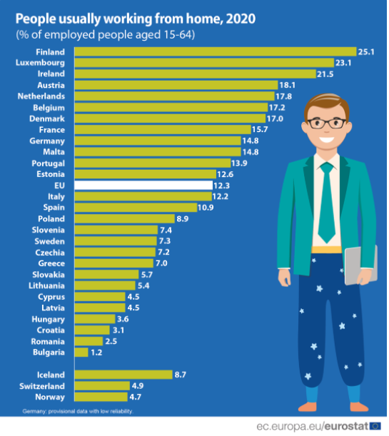 През 2020 г. 12.3% от работещите жители на Европейския съюз на възраст 15-64 г. обикновено са работели от вкъщи, сочат нови данни на статистическата служба на общността Евростат.