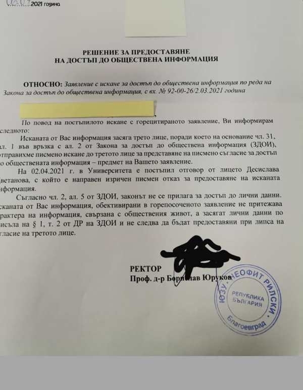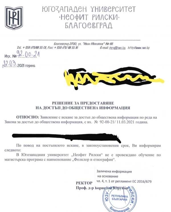 Изпратено е и искане до Югозападния университет "Неофит Рилски" за достъп до информация за магистратурата на назначения шеф на РИМ Десислава Цветанова. Отговорът от факултета в Благоевград категорично пък доказва, че такава магистратура никога не е имало в техните програми. Иначе казано, Цветанова е представила фалшива диплома, за да отговаря на условията за директор. Всичко това става със знанието на кмета Цветан Ценков, зам.-кмета Борислава Борисова и председателя на общинския съвет Генади Велков.