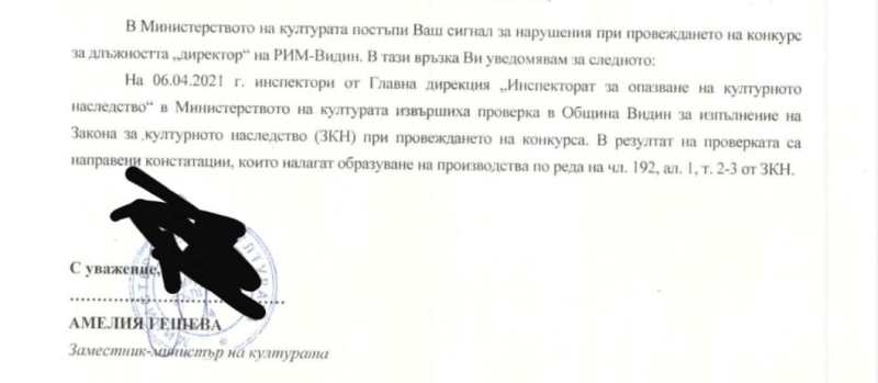 След разкритията за покварения конкурс в Община Видин е последвала проверка от инспектори на Главна дирекция „Инспекторат за опазване на културното наследство“ в Министерството на културата. В резултат на ревизията са констатирани нарушения, които налагат образуване на производства по реда на чл.192, ал.1, т.2-3 от Закона за културното наследство.