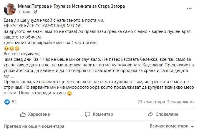 Мими Петрова от Стара Загора призова във фейсбук да не се купува месо от „Кауфланд”, което само в рамките на час е посиняло. Постът в групата „Истината за Стара Загора” събира гнева на хората в социалната мрежа.