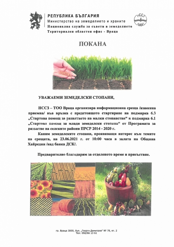 Национална служба за съвети в земеделието – Териториален областен офис Враца оргонизира информационна среща /изнесена приемна/ във връзка с предстоящото стартиране на подмярка 6.3 „Стартова помощ за развитието на малки стопанства“ и подмярка 6.1 „Стартова помощ за млади земеделски стопани“ от Програмата за развитие на селските райони ПРСР 2014-2020 г.