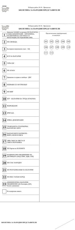На основание т. 7, изр. 2 от Решение № 50-НС от 20.05.2021 г. на ЦИК и уведомление с писмо с изх. № НС-15-506/25.06.2021 г. на ЦИК относно прието протоколно решение от 25.06.2021 г. на ЦИК, с което е разрешено публикуване на образеца на бюлетината за района на интернет страницата на РИК, РИК-Враца публикува образеца на бюлетината за Шести изборен район Врачански в изборите за народни представители на 11 юли 2021 г.