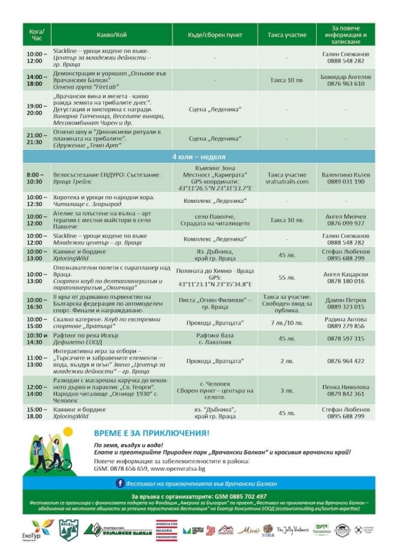 На 4 юли, любителите на фолклора ще се насладят на хоротека и уроци по народни хора, рафтинг по река Искър и интерактивни игри.