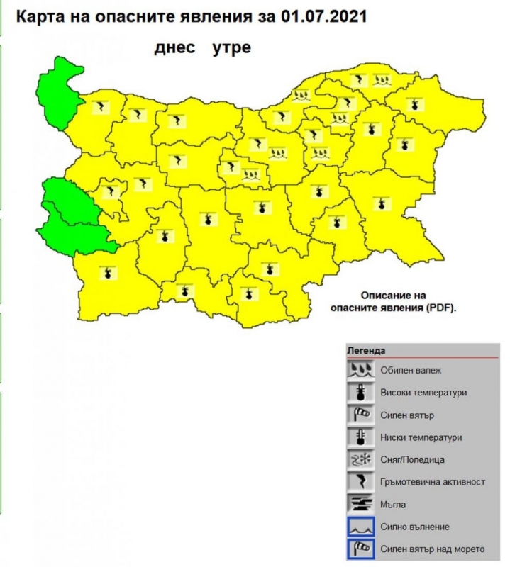 Жълт код за горещо време с температури над 35 градуса е обявен за областите - Благоевград, Пазарджик, Пловдив, Смолян, Хасково, Кърджали, Стара Загора, Ямбол, Сливен, Шумен, Добрич, Варна и Бургас. За областите София, София-област, Монтана, Враца, Плевен и Ловеч има жълт код за гръмотевични бури. За Габрово, Велико Търново, Русе, Търговище, Разград и Силистра има обявен жълт код за опасно време - мощни гръмотевични бури, интензивни валежи, на места количествата ще са около 40-50 mm, има условия и за градушки.