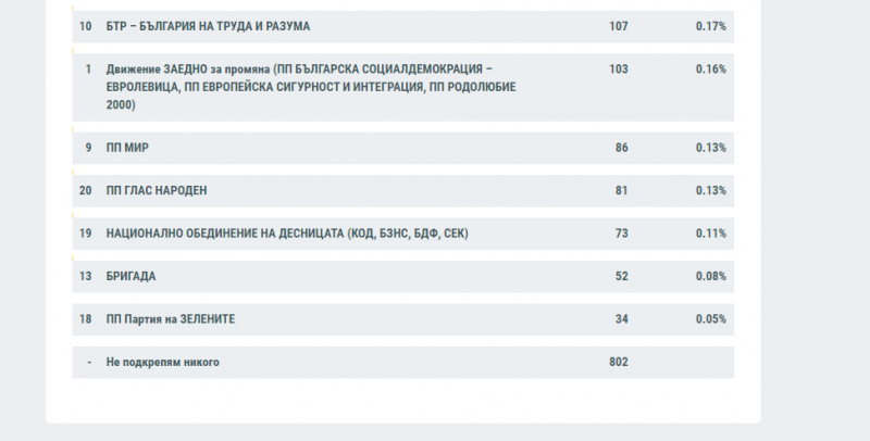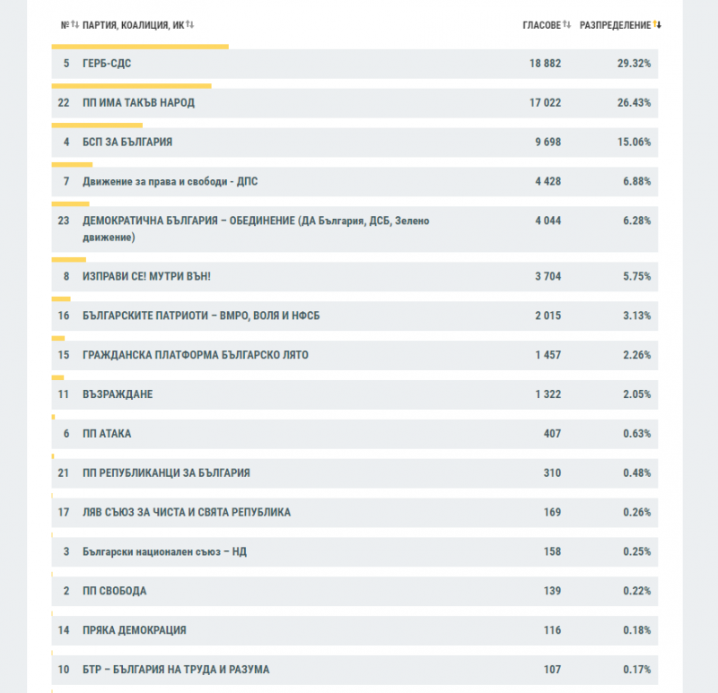 Коалицията е спечелила доверието на 29.32% от избирателите. Втора сила е "Има такъв народ" с 26.43%, а след нея се нарежда БСП с 15.06%. На четвърто място е ДПС с 6.88%. 6.28% от избирателите са дали своя вот за "Демократична България", а за "Изправи се! Мутри вън!" - 5.75%. След тях с 3.13% са Българските патриоти - ВМРО, ВОЛЯ И НФСБ. Партията на Васил Божков "Българско лято" печели 2.26% от гласовете на избирателите. "Възраждане" са получили доверието на 2.05%.