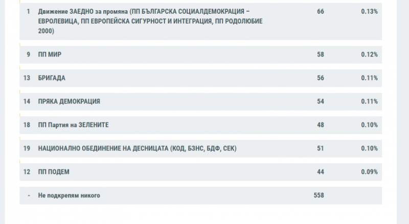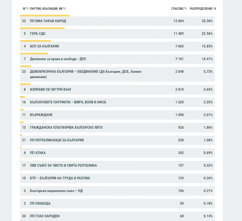 Партията на Слави Трифонов печели първото място с убедителните 25.36%. Второто място заема коалицията ГЕРБ-СДС с 22.96%. След нея се нарежда БСП с 15.83%, като плътно отзад стои ДПС с 14.41%. Петото място е отредено на Демократична България - 5.73%. На шеста позиция застава партията "Изправи се! Мутри вън! с 5.65%. 2.55% от избирателите са гласували за Българските патриоти – ВМРО, ВОЛЯ И НФСБ, а след тях е ПП "Възраждане" - 2.01%. 1.86% са гласовете, дадени за партията на Васил Божков "Българско лято".