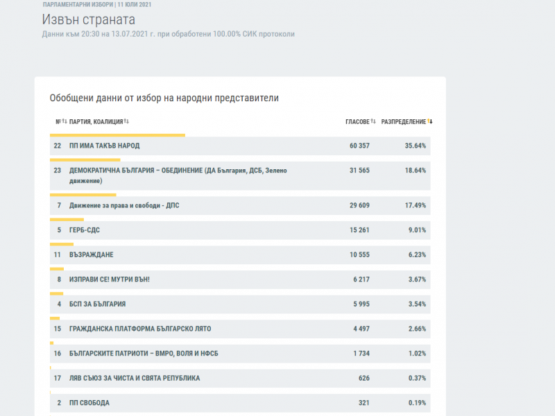 "Има такъв народ" печели убедително вота в чужбина при 100% обработени протоколи, сочат данните на ЦИК. Партиятана Слави Трифонов получава 35.64 на сто от вота на избирателите. Втори са "Демократична България" - с 18.64%. За ДПС са дали вота си 17.49% от избирателите зад граница. 9.01% получава коалицията ГЕРБ-СДС. На пето място се нарежда партия "Възраждане" с 3.67%, а веднага след нея са „Изправи се! Мутри вън!" 3.67%.