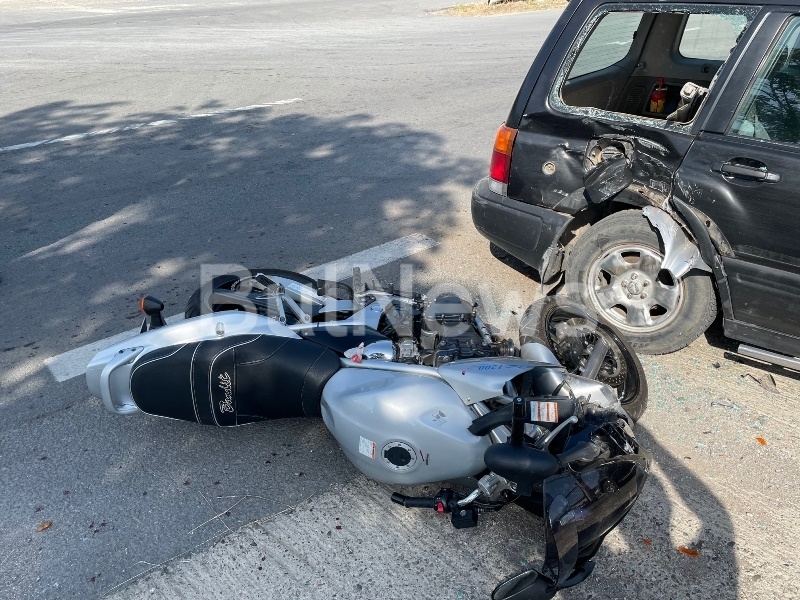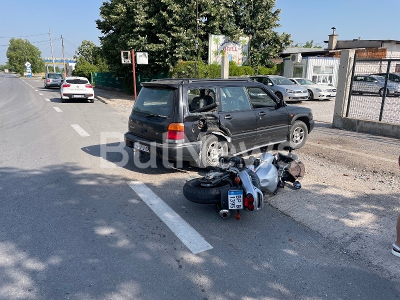 Вследствие на силния удар е пострадал мотористът, а шофьорът и жената, която е пътувала с него, са невредими.