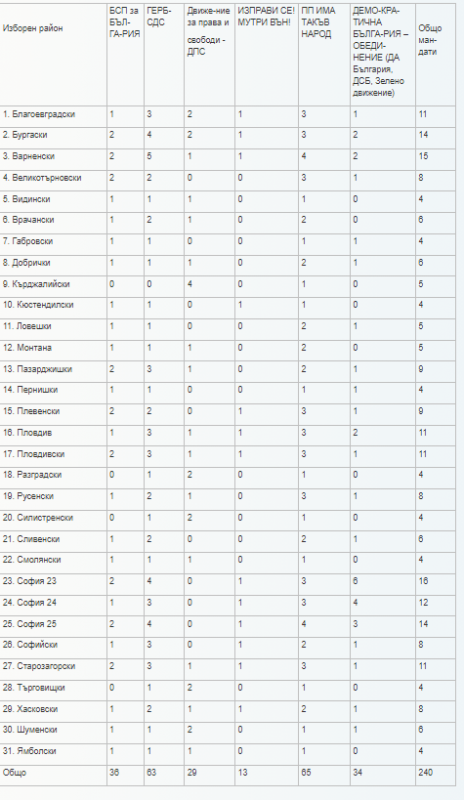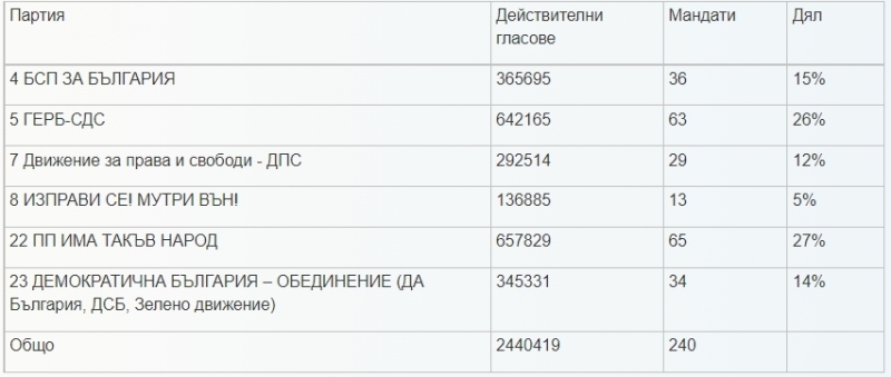 "Демократична България" вкарва 34-ма депутати, ДПС 29, а най-малката формация "Изправи се! Мутри вън!" ще има 13 депутатски места. Ясна вече е и окончателната избирателна активност - тя е 42.19% към 20 часа на неделния ден - с 8% по-ниска от изборите на 4 април.