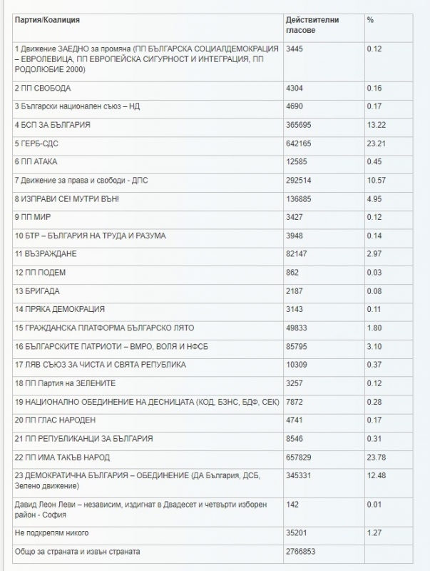 От решение, публикувано на страницата на ЦИК след полунощ, става ясно, че "Има такъв народ" официално ще бъдат най-голямата парламентарна група с 65 депутати. ГЕРБ ще имат 63-ма народни представители, а третите БСП са с 36.