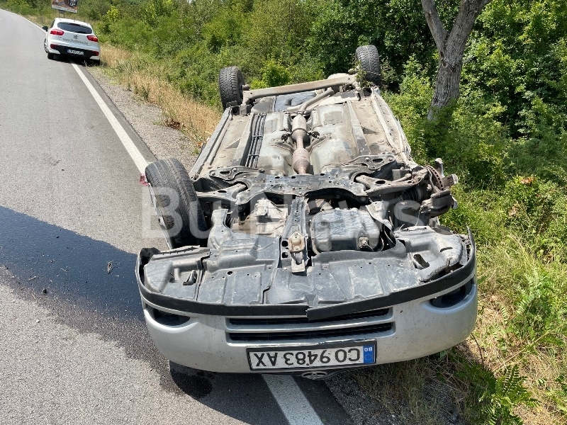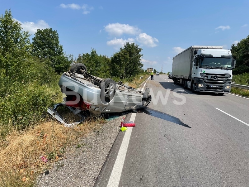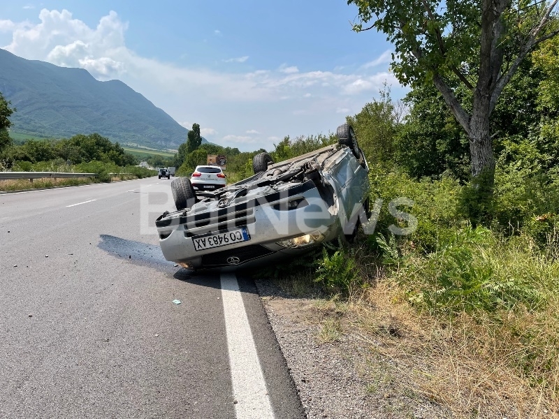 На мястото има полицейски екип, който регулира движението, тъй като катастрофиралата кола е по таван в дясната лента.