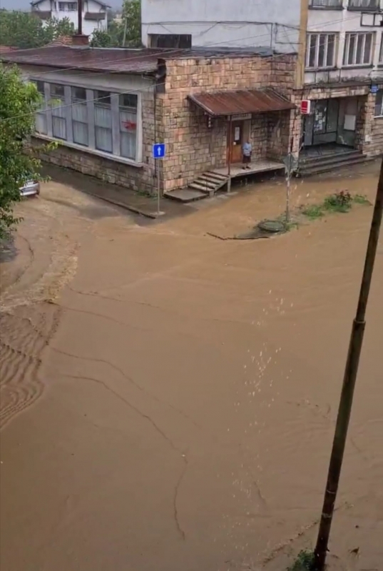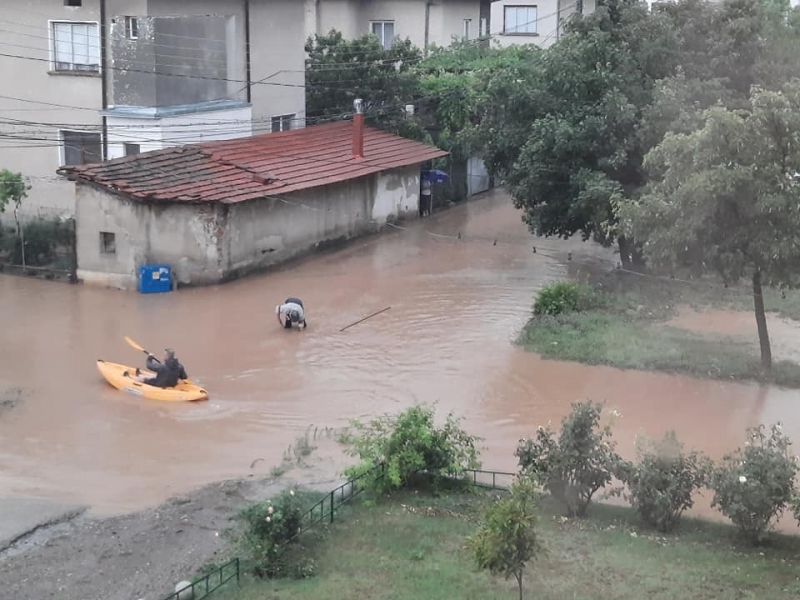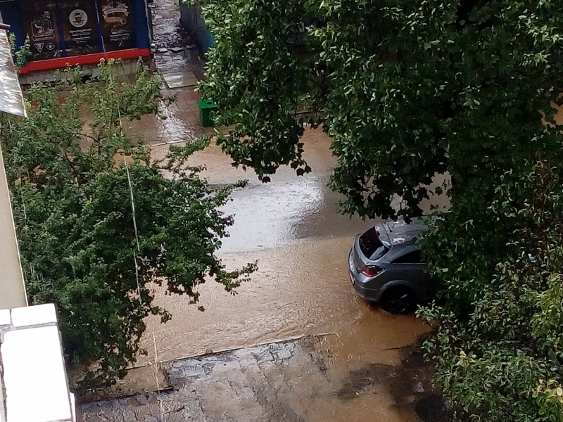 Втори ден над областния център валя като из ведро, а улиците са потънали под вода. В социалната мрежа се появиха снимки на мъж, който е излязъл навън с кану, тъй като е невъзможно по друг начин да се предвижи.
