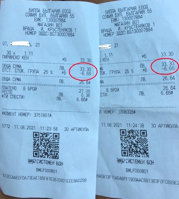 „Хора, бъдете внимателни и проверявайте касовите си бележки от БИЛЛА, защото за мен това е умишлена манипулация с цел печалба“, каза тя.