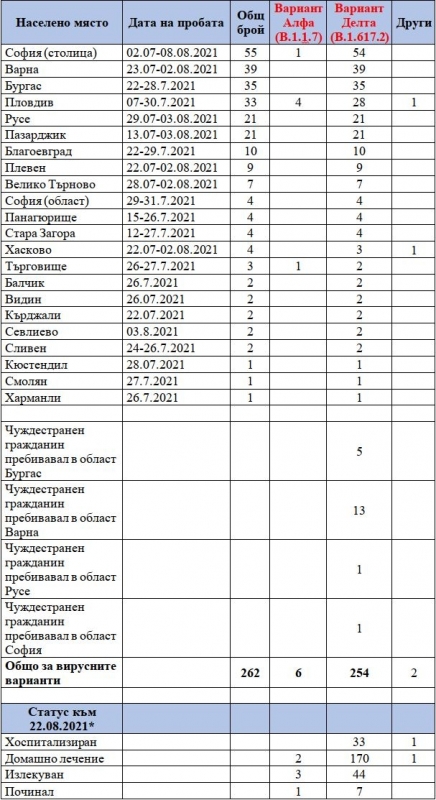 Клиничните проби са били взети от пациенти с COVID-19 в периода 2 юли - 8 август 2021 г. и са били изпратени от 49 различни лечебни заведения от 21 области на страната. Най-много проби с Делта вариант са били установени в София, Варна, Бургас, Пловдив, Русе, Пазарджик и Благоевград.