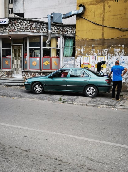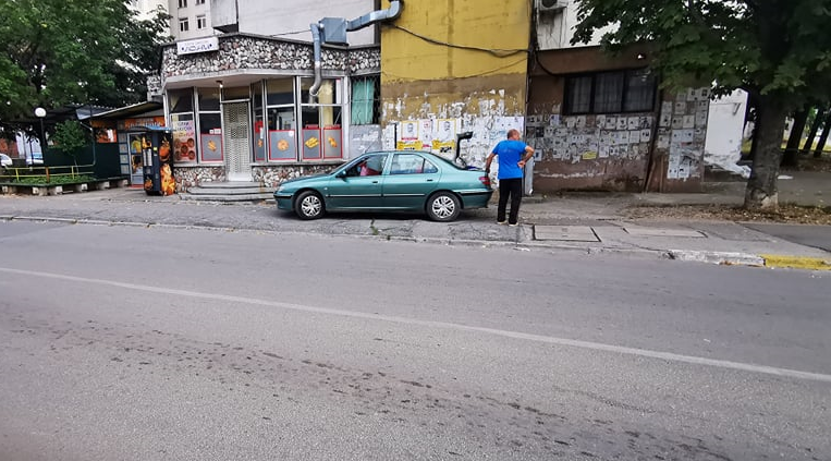 Водачът на лекия автомобил "Пежо 407" е паркирал най-спокойно возилото си, за да му е по-удобно да си натовари багажа. Видимо възрастният мъж не се е притеснил от неудобството, което е създал за вървящите по тротоара хора.