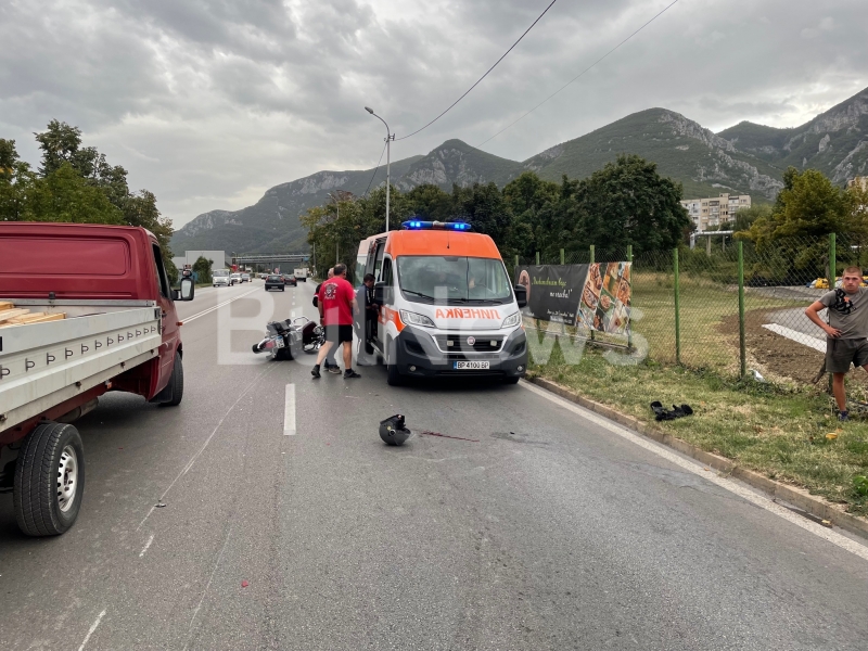 Веднага свидетели на катастрофата подали сигнал на тел. 112 и на мястото пристигнали 2 патрулки и линейка. В момента пострадалият е качен в спешния автомобил и лекарите му оказват първа помощ на място. По първоначални данни при удара той сериозно е наранил лицето си. На асфалта продължава да стои неговата каска, а около нея има много кръв.