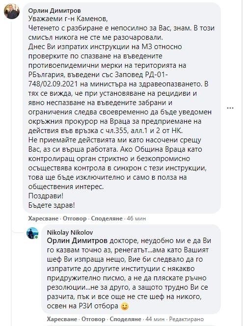 Подобно обвинение на държавен чиновник, временно поставен на определена позиция, към кмет, който е избран на последните избори със смазващото мнозинство от 76% е недопустимо. Очевидно Орлин Димитров отдавна е счупил своята мярка за благоприличие и затова обижда наред своите опоненти във фейсбук. Подобно публично поведение между институциите е неприемливо и с нищо не допринася врачани да живеят по-спокойно.