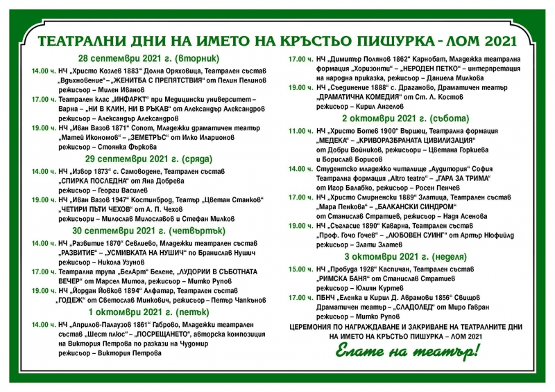 Празничната програма ще започне в 11 часа с поднасяне на венци и цветя на паметника на Кръстьо Пишурка. От 14 часа в НЧ „Постоянство 1856“ ще се проведе кръгла маса „Известно и неизвестно за Кръстьо Пишурка“, с участието на ученици от ломските училища. От 17 часа пред читалището ще бъде открита алея „Творци на красота“, а след това ще се проведат лекоатлетическа щафета, фолклорно надиграване и акробатическа композиция. Приветствените слова по повод юбилея ще бъдат произнесени в 18 часа пред читалището, а час по-късно е премиерният спектакъл на Драматичен театър „Кръстьо Пишурка“ - „Огнивото“ по Ханс Криястиян Андерсен, с режисьор Николай Априлов.