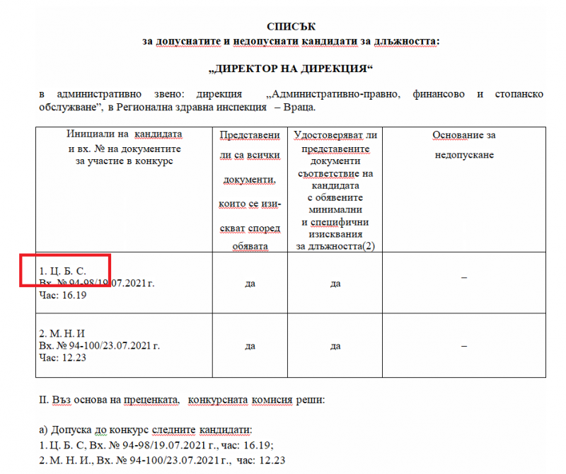 На 13 юли е бил обявен конкурс за длъжността „Директор дирекция АПФСО“ в РЗИ-Враца. Изискванията за допускане до него са професионален опит - 4 години и минимален ранг: Трети младши. От публикуваните в сайта на здравната инспекция правила се разбира, че поставените критерии изискват наличието и на двете условия.