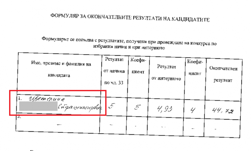 До участие в конкурса са допуснати двама кандидати - Ц.Б.С. и М.Н.И. От публикувания протокол на комисията става ясно, че зад първите инициали се крие Цветелина Страшимирова, която и печели надпреварата за вакантното място.