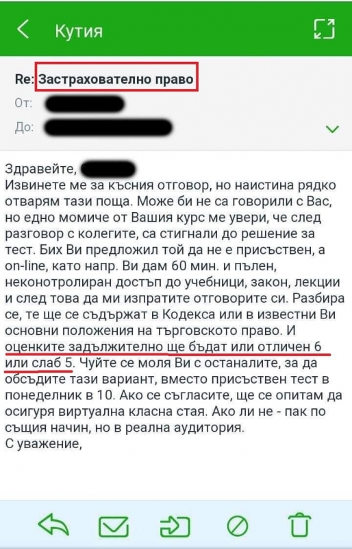 Държавата ни се пълни с „йористи”. Преподавател по право в Юридически факултет на Софийския университет е обещал на студентите оценките, които биха могли да получат на предстоящия изпит по "Застрахователно право", в случая „отличен” 6 и „слаб” 5, съобщава Lupa.bg.
