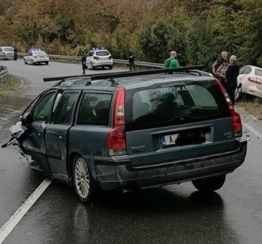 Автомобил с бургаска регистрация навлязъл в насрещното на завой и удря последователно две коли, една от които - с турски номер. Пострадали са шофьорът и пътник в първия блъснат автомобил. Те са откарани с линейка в УМБАЛ-Бургас.