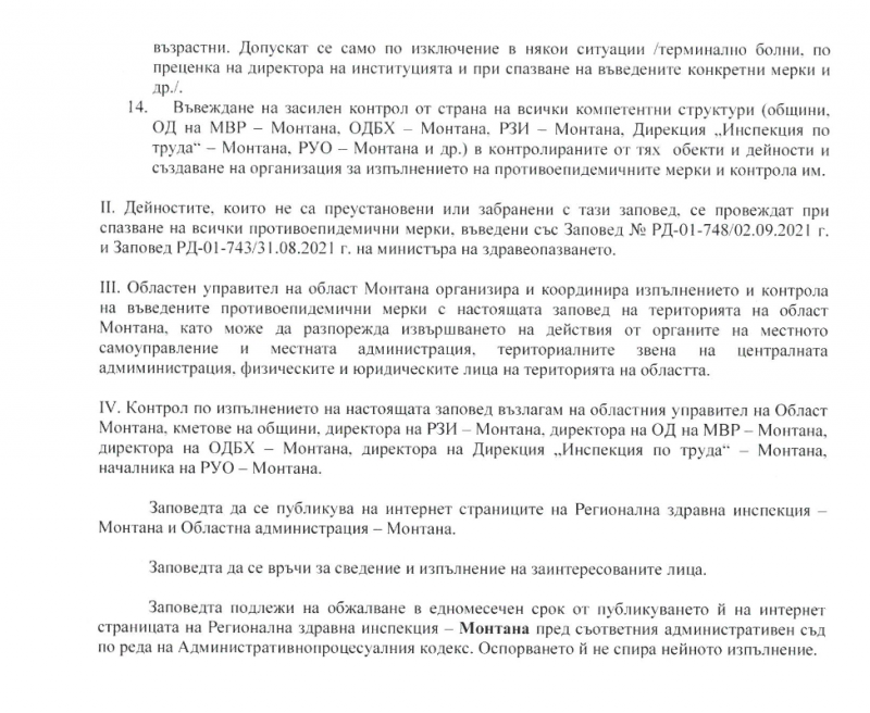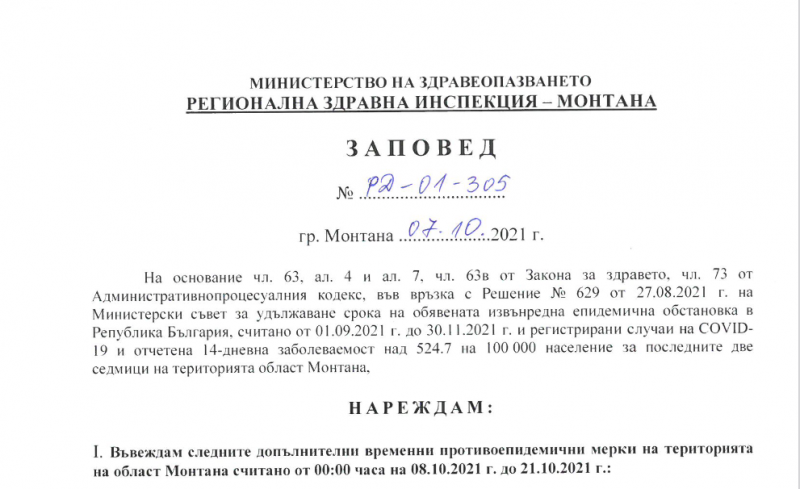 Със заповед на директора на РЗИ-Монтана Елена Борисова, от днес до 21 октомври на територията на областта не могат да се провеждат сватби и кръщенета, спират се груповите занятия в обучителните центрове – езикови, танцови, музикални школи, посещенията във фитнес зали и СПА центрове.