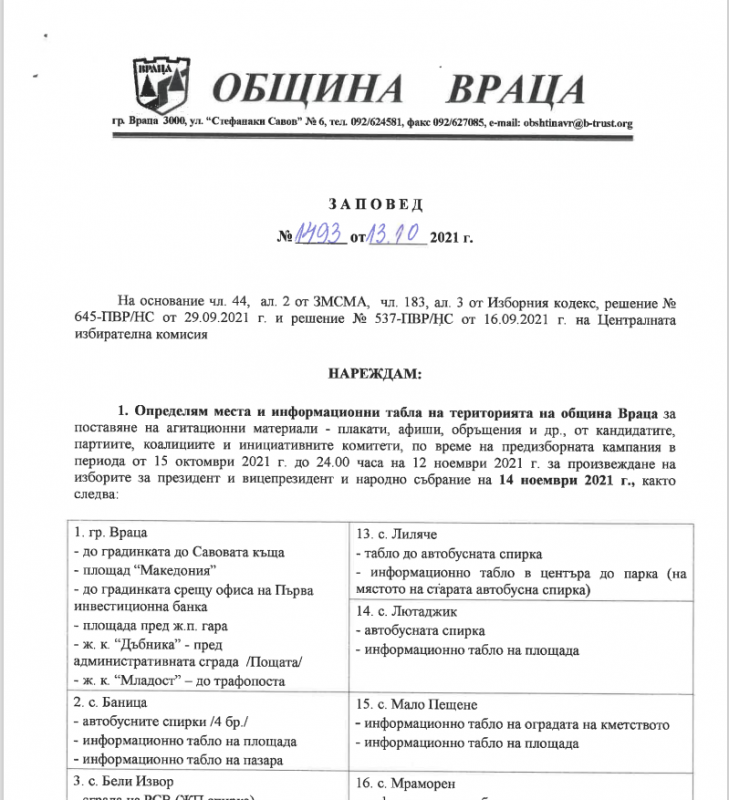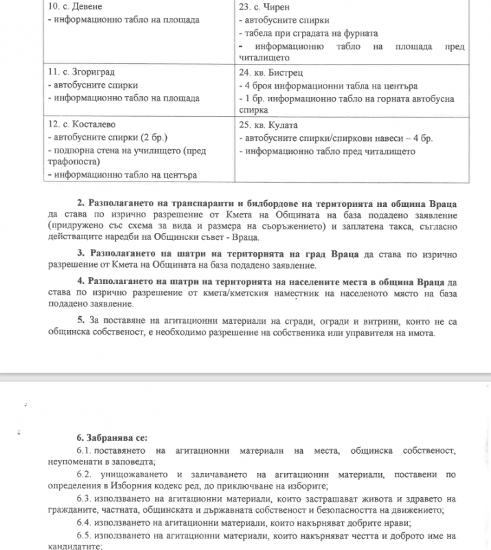 Кметът на Враца определи места и информационни табла на територията на общината за поставяне на агитационни материали.