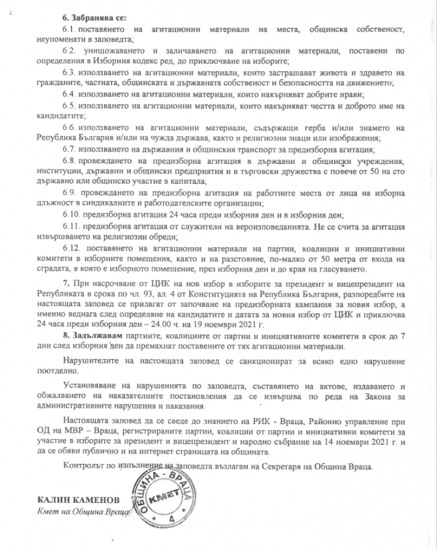 Градоначалникът е издал заповед, в която е описано къде може да се разпространяват плакати, афиши, обръщения и др. от кандидатите, партиите, коалициите и инициативните комитети по време на предизборната кампания в периода от 15 октомври до 12 ноември.