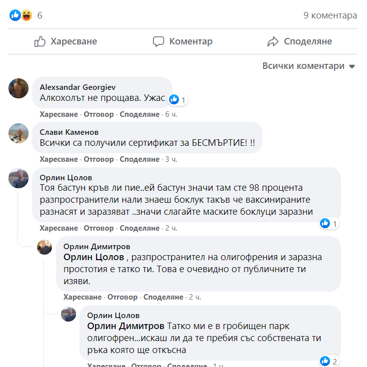 С течение на времето обаче компрометираният директор на здравната инспекция отново започна да изпуска нервите си при общуването във фейсбук. Така се стигна до онзи ден, когато той грубо нападна член на групата „Да се преброим като врачани“, без да е бил предизвикан. Поводът за напрежението беше поредното споделяне от негова страна на публикация на турския сайт „Конкурент“, към който има сериозно изтичане на информация от РЗИ. Жертва на агресията на Орлин Димитров става Орлин Цолов, който изразява своето мнение за противоречивата ваксинационна кампания, провеждана от шефа на здравната инспекция. Без да познава своя опонент, Димитров директно го обижда, като пише на Цолов, че “разпространител на олигофрения и заразна простотия е татко ти“. Оказва се обаче, че бащата на човека е покойник и написаното става изключително неуместно. Това става причина Орлин Цолов да го предупреди за вероятен побой, който ще му бъде нанесен заради опорочаването на паметта на родителя му.