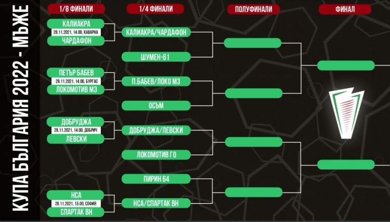 Междувременно беше изтеглен жребият за първия предварителен кръг от турнира „Купа България“ 2022 при мъжете. В него ХК Локомотив (Мездра) ще гостува на второешелонния ХК Петър Бабев (Несебър). В останалите срещи съперници са Калиакра (Каварна) - Чардафон (Габрово), Добруджа (Добрич) - Левски (Левски) и НСА (София) - Спартак (Варна). Двубоите са на 28 ноември.