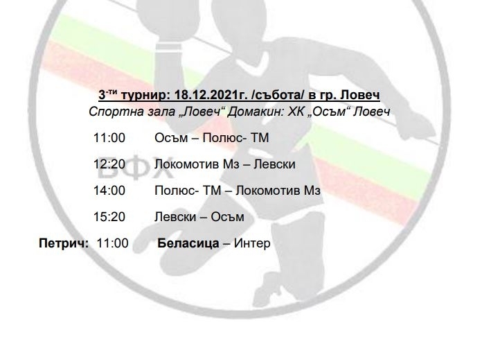 Следващият турнир е на 18 декември в Ловеч, където ще се срещнат Осъм (Ловеч) - Полюс ТМ (Плевен), Локомотив (Мездра) - Левски (Левски), Полюс ТМ (Пл) - Локомотив (Мз) и Левски (Лев) - Осъм (Лч). По същото време Беласица приема в Петрич Интер (Благоевград).