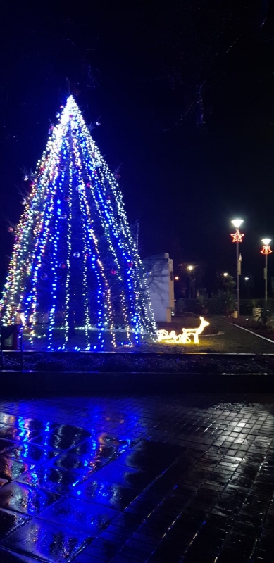 Главната улица на града е украсена със светещи коледни и новогодишни фигурки, придаващи празнична атмосфера.