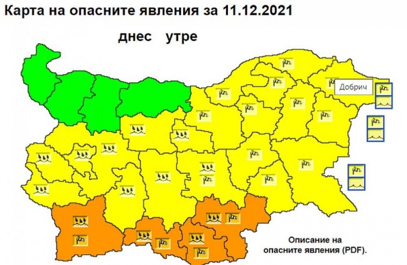 Има предупреждение за опасно време в почти цялата страна. НИМХ обявява оранжев код за силен вятър и за значителни валежи в четири области на страната - Благоевград, Смолян, Кърджали и Хасково, а жълт код - в 20. Единствено във