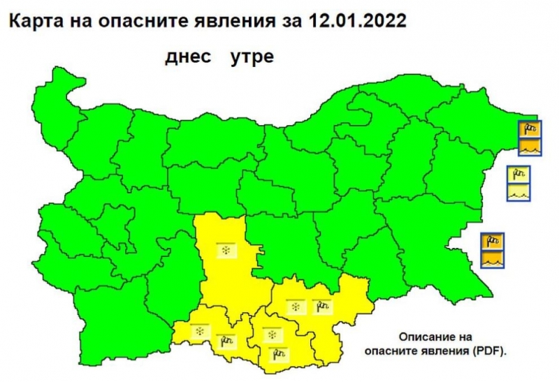 В планините преди обяд на много места все още ще превалява сняг, но валежите бързо ще спрат и облачността на много месата ще се разкъса. По-значителна ще се задържи над Странджа и Сакар. Ще духа силен, по билата - бурен, североизточен вятър. По старопланинските проходи ще има навявания. Ще е студено с максимална температура на височина 1200 метра около минус 4 градуса, на 2000 метра - около минус 7 градуса.