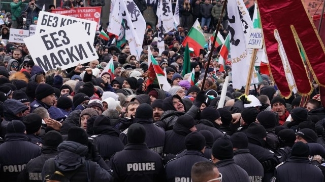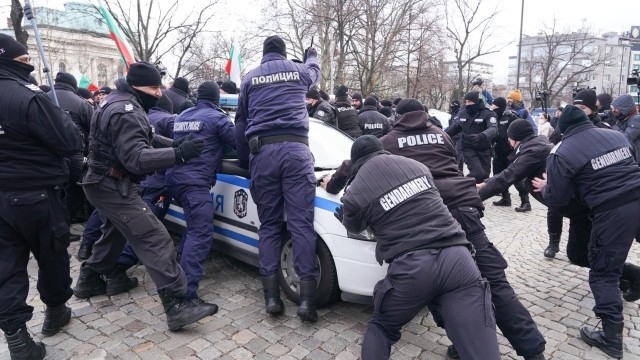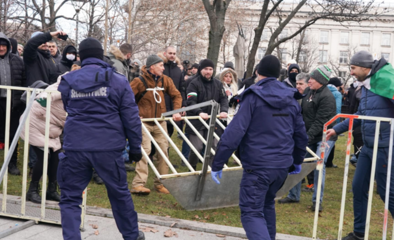 Протестиращите, симпатизанти на партия "Възраждане", издърпаха част от металните заграждения в опит да минат през задния вход на Народното събрание.