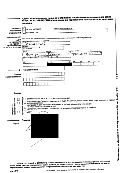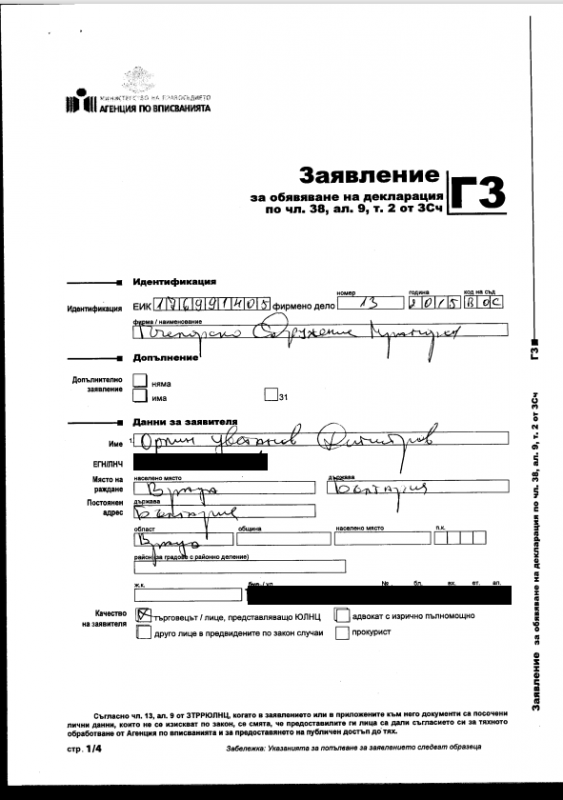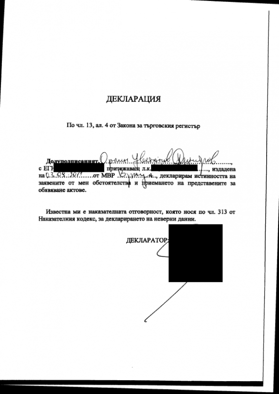 Друг интересен факт буди недоумение и заслужава вниманието на МВР. Съгласно Заявление: Декларация, че заявлението и приложените към него документи са предоставени от заявителя - вписване на 17.08.2021 г. в 16:40:25 ч. е подаден номер на лична карта и дата на издаване. Съгласно Заявление: Декларация относно истинността на заявените за вписване обстоятелства и приемането на представените за обявяване актове - вписване на 24.08.2021 г. в 09:52:04 ч. е подаден коренно различен номер на лична карта, както и дата на издаване!