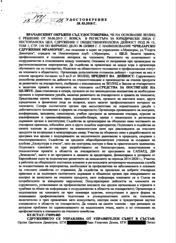 Всички цитирани документи са публични в информационна система „Сиела“, в досието на Сдружение „Пчеларско сдружение-Мраморен”, в отразените по години записи и подлежат на проверка от всеки един с достъп до програмата.