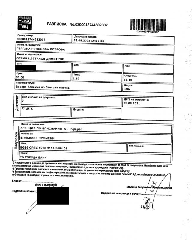 Видно от Разписка за внесена сума, Снимка 6, Орлин Димитров внася такса към ТР за вписване на промени на 28.08.2021 г. Документът фигурира в „Сиела“ с вписване на 31.08.2021 г. в 11:52:03 ч. Три месеца след подаване на Заявлението си за прекратяване на членството си в Сдружението!!!!