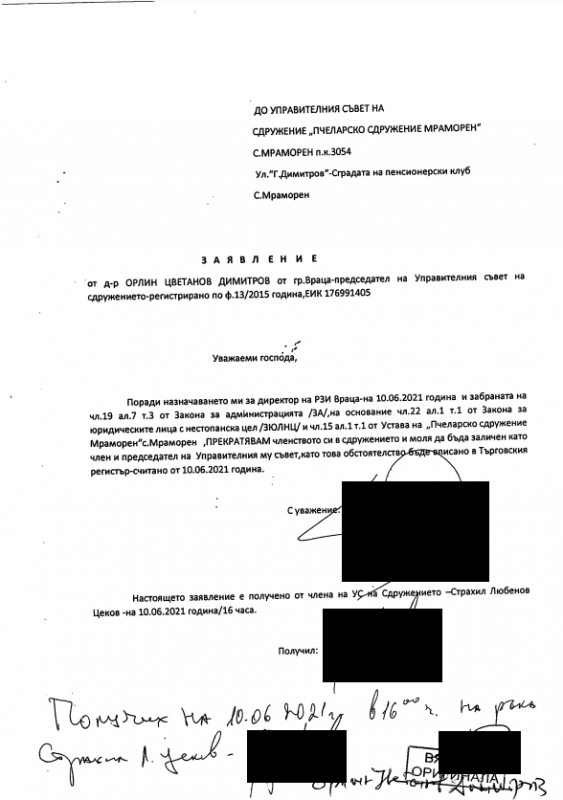 Видно от Снимка 1, свалена от Информационна система „Сиела“, д-р Орлин Димитров, Директор на РЗИ – Враца, подава Заявление с дата 10.06.2021 г. до УС на Сдружение „Пчеларско сдружение-Мраморен” за прекратяване на членството си, съгласно разпоредбите на чл. 19, ал. 7, т. 3 от Закона за администрацията, в качеството си на орган по ал. 4 на чл. 19 от ЗА „(4) За органи на изпълнителната власт се считат и: