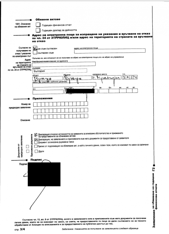 При преглед на досието на Сдружение „Пчеларско сдружение-Мраморен” в „Сиела“, фигурира документ, вписан на 17.08.2021 г. в 16:40:25 ч. Документът, Снимка 2, е Декларация по чл. 13, ал. 4 от Закона за търговския регистър, подписана без дата от Орлин Димитров. Към същата дата той все още фигурира като Председател и член на УС! Орлин Димитров подава и Заявление по чл. 38, ал. 91 т. 2 от ЗСч, Снимка 3, касаещо публичност на финансовите отчети, без да е посочен периодът. Заявлението е вписано в „Сиела“ на 17.08.2021 г. в 16:40:25 ч. Заявлението няма дата. Качеството на заявителя е лице, представляващо сдружението!