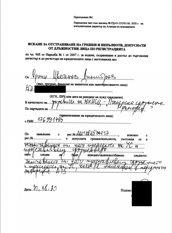 На 31.08.2021 г. Орлин Димитров подава Искане, Снимка 7, в качеството му на Управител на Сдружението!!!! за Отстраняване на грешки и непълноти, допуснати от длъжностни лица по регистрацията.