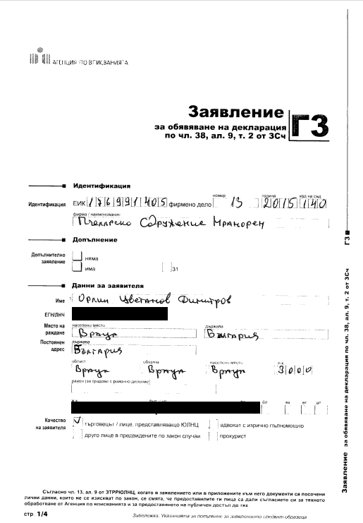 Следващо вписване е на 24.08.2021 г. в 09:52:04: Данни от Търговски регистър: Орлин Димитров все още фигурира като Председател и член на УС! Отново е подадено Заявление по чл. 38, ал. 91 т. 2 от Зсч, Снимка 4, касаещо публичност на финансовите отчети. Заявлението е вписано в „Сиела“ на 24.08.2021 09:52:04 ч. Заявлението е без дата.