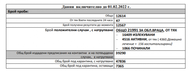 Към момента активните случаи в област Враца са 4516, от тях 4360 са на домашно лечение, а 156 са хоспитализирани.