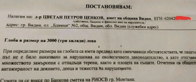 Кметът на Видин Цветан Ценков отнесе 3 хил. лв. глоба заради непочистени сметища в града, научи агенция BulNews.