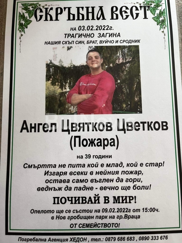 Погребението на 39-годишния мъж ще бъде в сряда /9 февруари/, от 15 часа, в Новия гробищен парк в града.